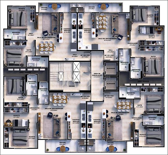 🔹 Tipo 04 - 2 dorm. (1 suíte) - 1 vaga - Área priv. 76.6m²